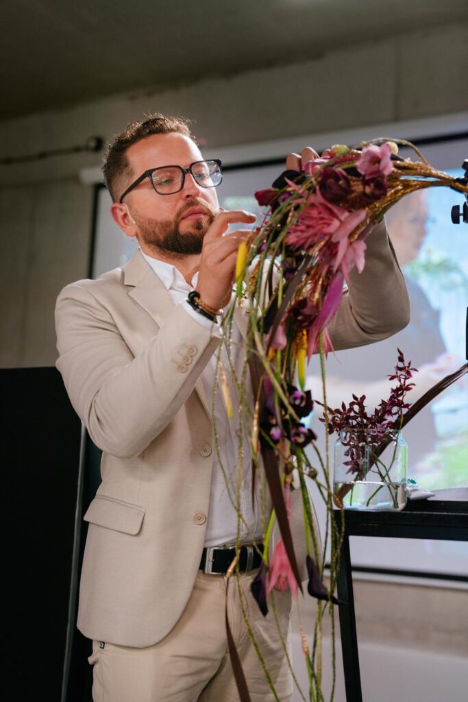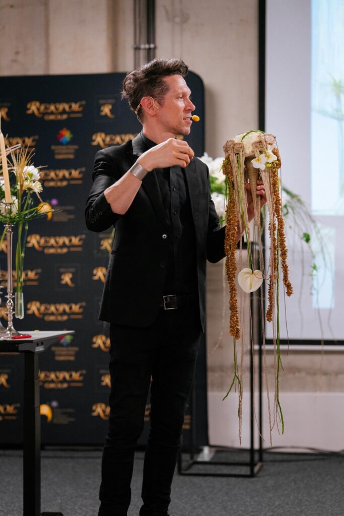 Gościem specjalnym był Bart Hassam, Mistrz Świata we florystyce z 2019 roku, który zaprezentował autorskie kompozycje ślubne, zachwycające precyzją wykonania, subtelnością form i niezwykłym wyczuciem estetyki.