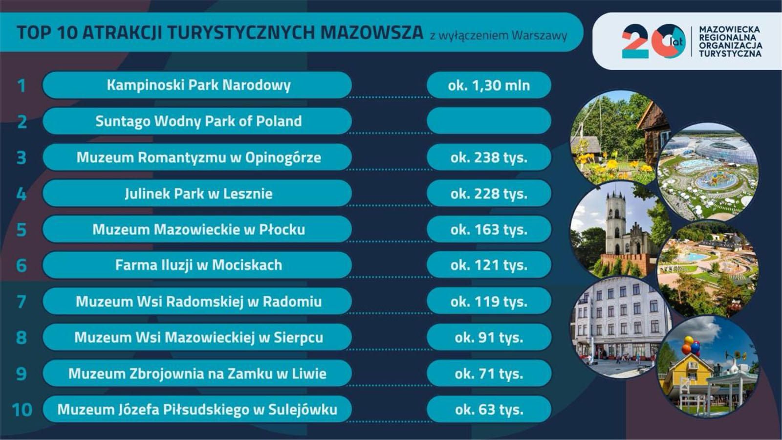 Po wyłączeniu atrakcji z Warszawy wyraźnie widać, jak zróżnicowana jest mazowiecka oferta turystyczna poza stolicą. Poniższe zestawienie pokazuje potencjał regionu i zachęca do odkrywania jego mniej oczywistych, ale równie atrakcyjnych miejsc.