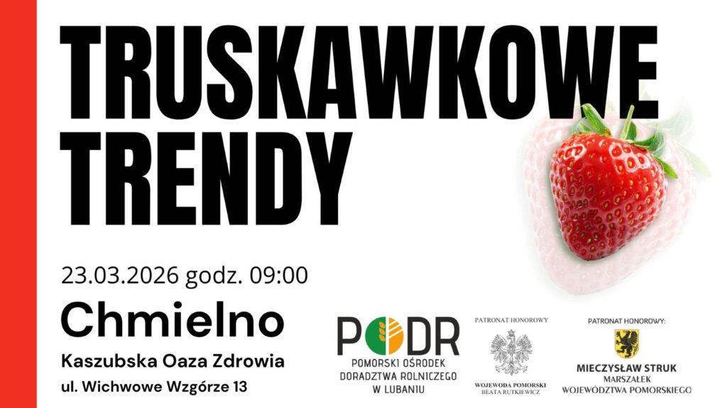 Pomorski Ośrodek Doradztwa Rolniczego w Lubaniu zaprasza na konferencję „Truskawkowe trendy”, poświęconą najnowszym rozwiązaniom w uprawie truskawek i innych owoców jagodowych. Wydarzenie odbędzie się 23 marca 2026 r. o godzinie 9:00 w Kaszubskiej Oazie Zdrowia w Chmielnie (ul. Wichrowe Wzgórze 13). Podczas konferencji eksperci z instytutów naukowych oraz firm branżowych przedstawią aktualne wyzwania i nowe technologie w […]