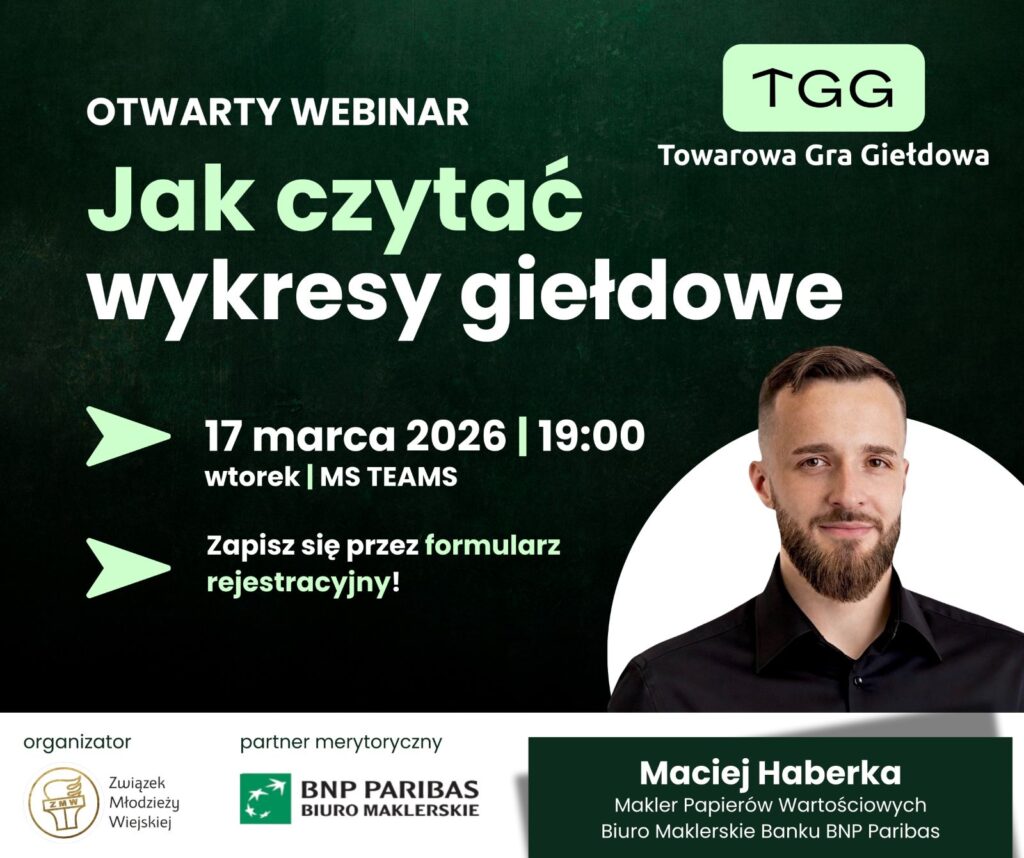 Związek Młodzieży Wiejskiej wraz z Towarową Giełdą Energii serdecznie zaprasza na otwarty, bezpłatny webinar realizowany w ramach ogólnopolskiego projektu edukacyjnego Towarowa Gra Giełdowa. 📅 Data: 14 kwietnia 2026 r. (wtorek)🕖 Godzina: 19:00💻 Platforma: MS Teams🎓 Udział bezpłatny Link do zapisów: https://forms.gle/dWymL4E28FjvfYjaA Podczas spotkania uczestnicy będą mieli okazję poznać mechanizmy funkcjonowania giełd towarowych oraz rolę nowoczesnych […]