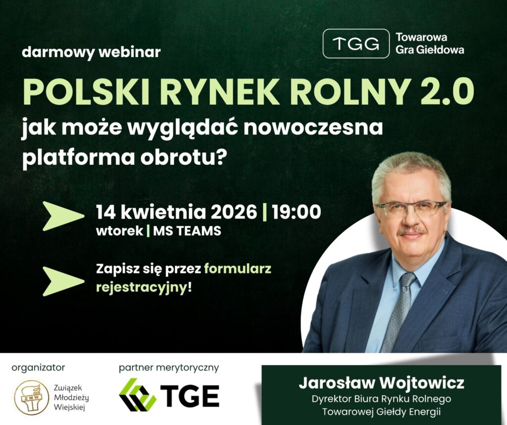 Związek Młodzieży Wiejskiej wraz z Towarową Giełdą Energii serdecznie zaprasza na otwarty, bezpłatny webinar realizowany w ramach ogólnopolskiego projektu edukacyjnego Towarowa Gra Giełdowa.